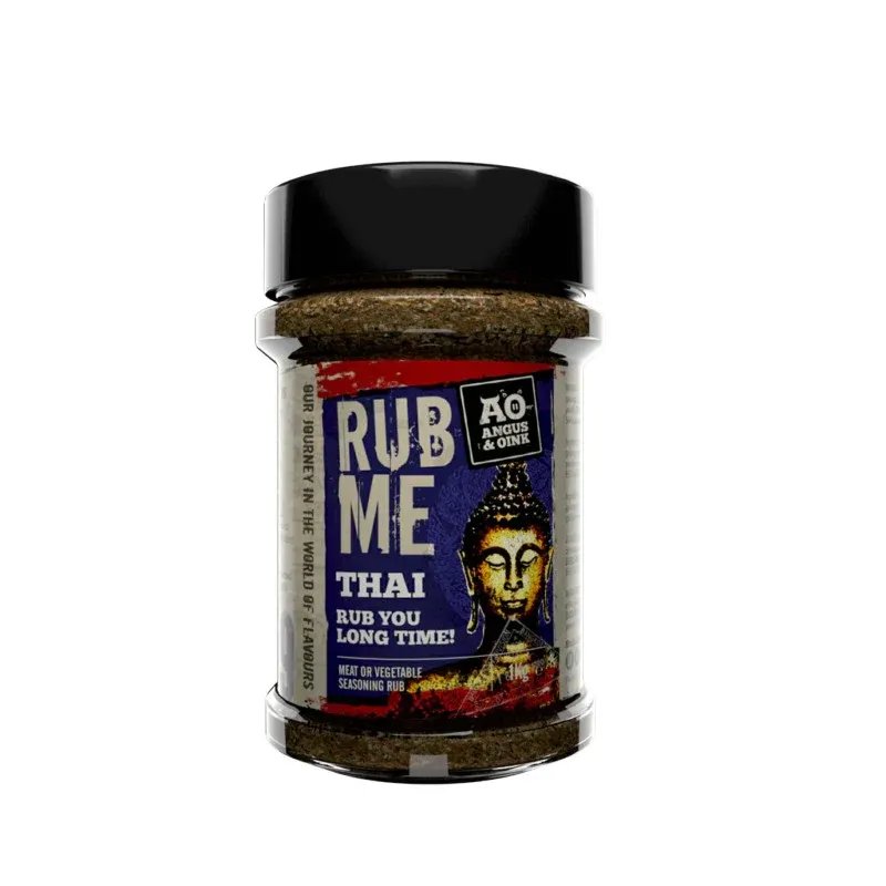 De Angus & Oink Thai Rub is ontwikkeld met inspiratie uit de Thaise keuken. Scherp met Kaffir Lime, garnalen en chili. Voeg de heerlijke exotische smaken toe aan bijvoorbeeld je Thaise Curry, noedels of chicken wings!
