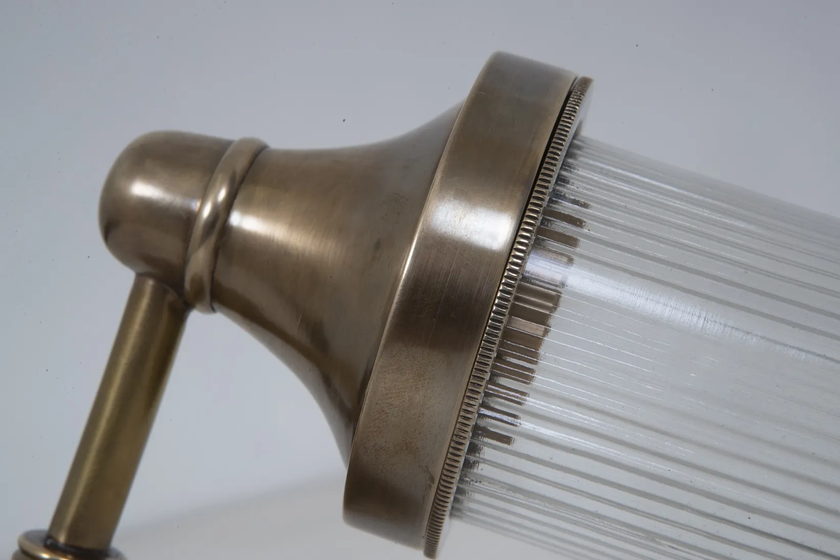 Ben je fan van stoer en nostalgisch dan is de badkamerlamp stoer retro (IP54) helemaal jouw lamp. Zeg maar dag tegen die saaie badkamerlampjes. Deze wandlamp heeft een strak landelijke uitstraling, gecombineerd met een diepe goudkleur en stevig geribbeld glas in een langgerekte vorm. Mooie retro details zijn de randjes in de armatuur die is gemaakt van messing / brass. Door al deze kenmerken wordt de badkamerlamp tijdloos, stoer én elegant.
