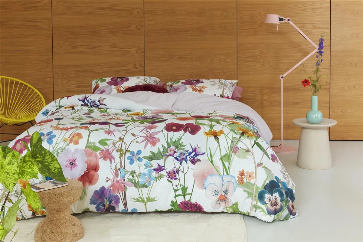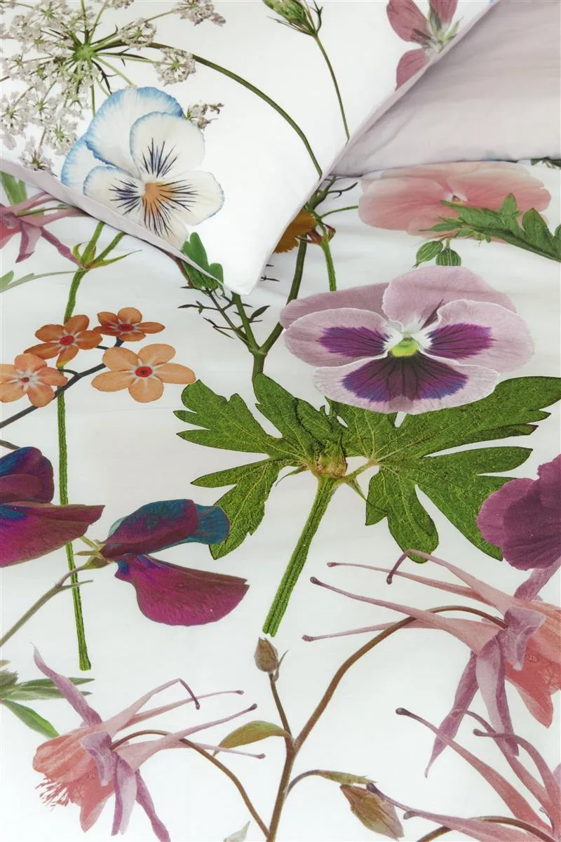 Suchst du nach einem sommerlichen Blumendesign? Dann entscheide dich für den Bettbezug Sunny, der Stiefmütterchen, Nelken, Vergissmeinnicht, Akelei und Kuhsilie auf einem frischen weißen Hintergrund zeigt. Die Rückseite des Bettbezugs ist einfarbig fliederfarben.