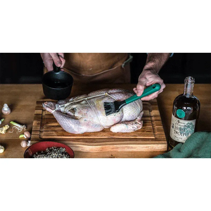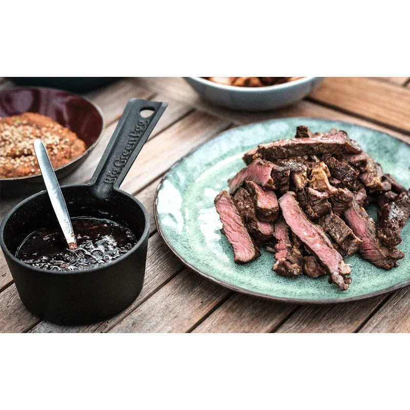 Of het nu gaat om gesmolten boter voor maïskolven, een honingmarinade voor kip, of een saus met cider en appels voor varkensvlees, de Cast Iron Sauce Pot with Basting Brush is er perfect voor. Dankzij zijn uitstekende warmtebehoud blijft de sauspan ook op tafel lang warm. De Basting Brush is gemaakt van siliconen, waardoor hij lang meegaat. De diameter van de sauspan is 12 cm.