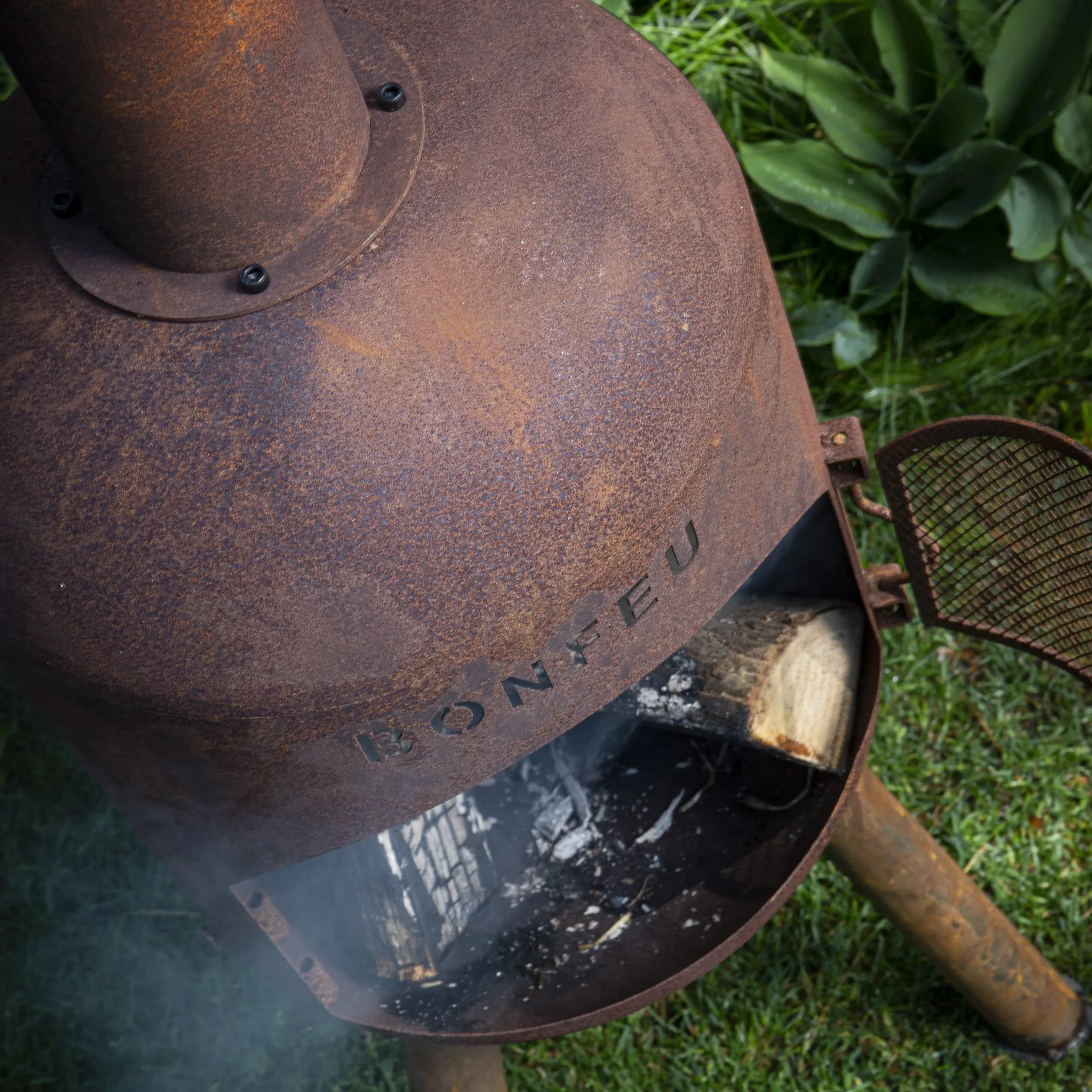 De Bonsolo, een ronde tuinhaard van Bonfeu. Niets dan charme. Deze terraskachel is er niet zomaar eentje. Ontworpen om het niet enkel heerlijk warm te houden wanneer het buiten afkoelt, maar evengoed om op te koken. Bij deze terraskachel wordt standaard een grillrooster geleverd dat je makkelijk in en uit de haard kan schuiven om heerlijk op te grillen. Gedaan met bakken? Haal het rooster er dan makkelijk af en geniet verder van het vuurtje.