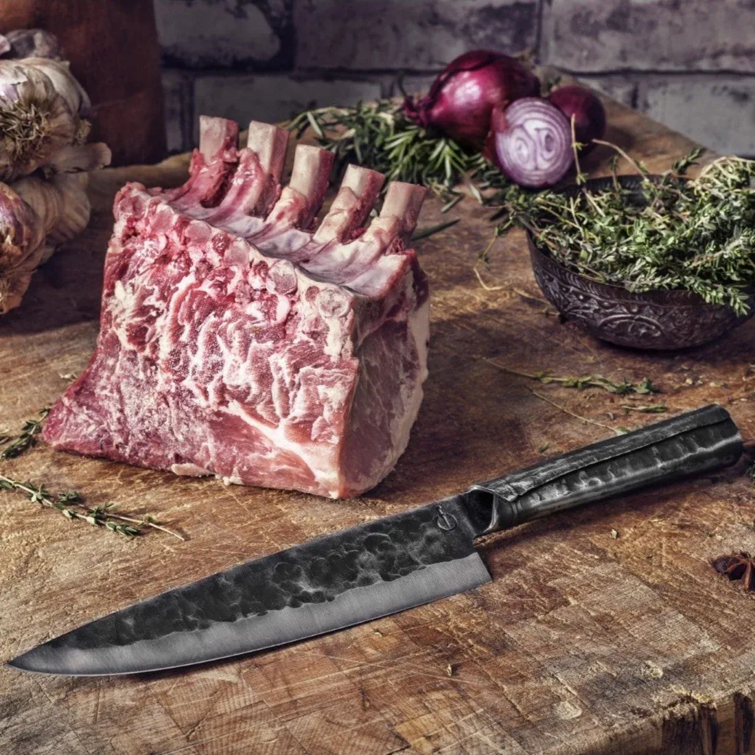 Dit met de hand gesmede koksmes is een ware alleskunner. Of je nu vlees tranchert, groenten fijnsnijdt of kruiden hakt, met dit mes werk je als een echte chef. Gemaakt van hoogwaardig Japans staal met een hardheid van 58 Rockwell, garandeert dit mes langdurige scherpte en precisie.