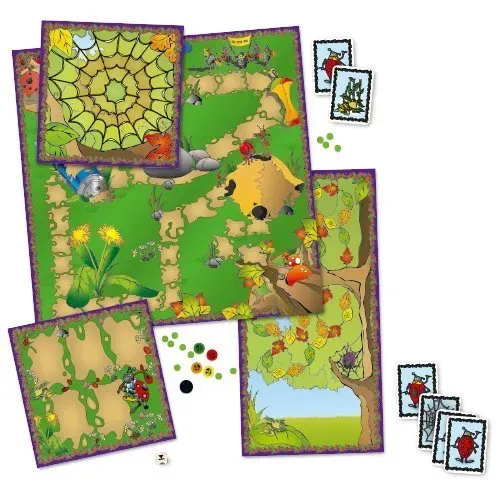 In ‘Het web’ speel je met achterzijde van het gesloten spelbord. In deze variant doorkruis je een spinnenweb en ga je op zoek naar drie kaarten met lieveheersbeestjes met eenzelfde aantal stippen.