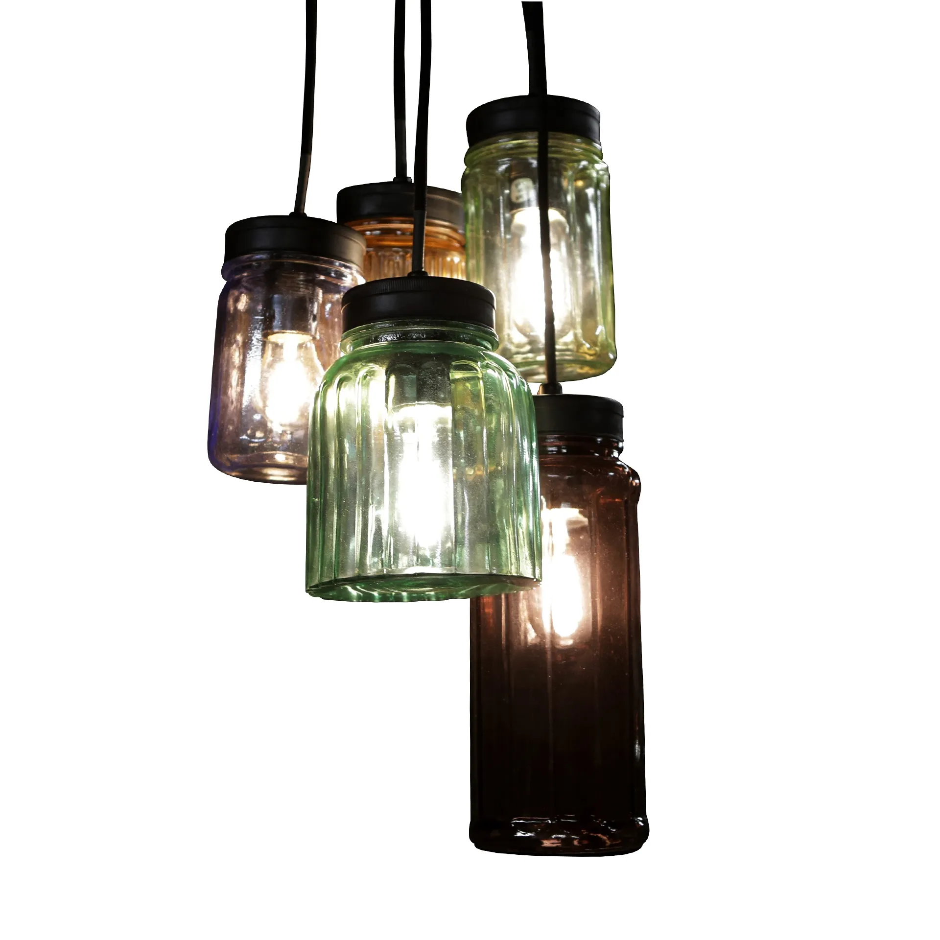 De totale hoogte van de hanglampen is 29cm. De doorsnede van de glazen is 9cm. De glazen lampen/potten hangen aan zwart katoenen snoeren. De lengtes van de snoeren zijn iets verschillend. Hierdoor hangen de lampen in een speelse bundel. De gekleurde glazen hanglampen hebben normale fittingen (E27), geschikt voor spaar- en LED verlichting.