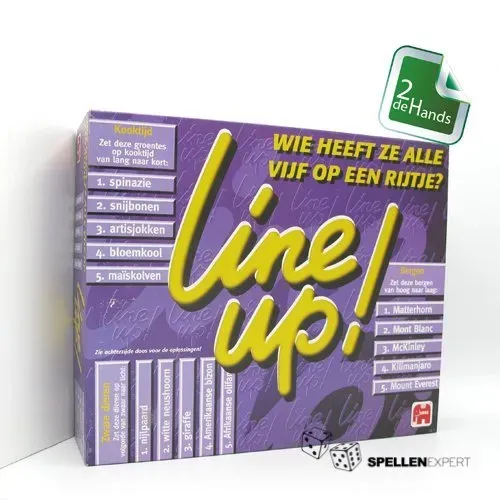 Line Up! Wie heeft ze alle vijf op een rijtje? Elke beurt wordt er een kaartje in de kaarthouder gezet. Daarop staan 5 dingen die je in de juiste volgorde moet zetten. Van hoog naar laag, op chronologische volgorde of van veel naar minder. Bijvoorbeeld, van hoogste berg naar laagste berg. In je team overleg je wat volgens jullie de beste volgorde is. Je zet de kaartjes in de houder en wacht tot ook het andere team klaar is. Vervolgens wordt er gekeken hoeveel van de vijf je team op de goede plek heeft gezet. Voor elk antwoord dat op de goede plek staat, mag de pion een stapje vooruit op het speelbord. Zo ga je door tot de finish. Wie als eerste de eindstreep bereikt, wint het spel!