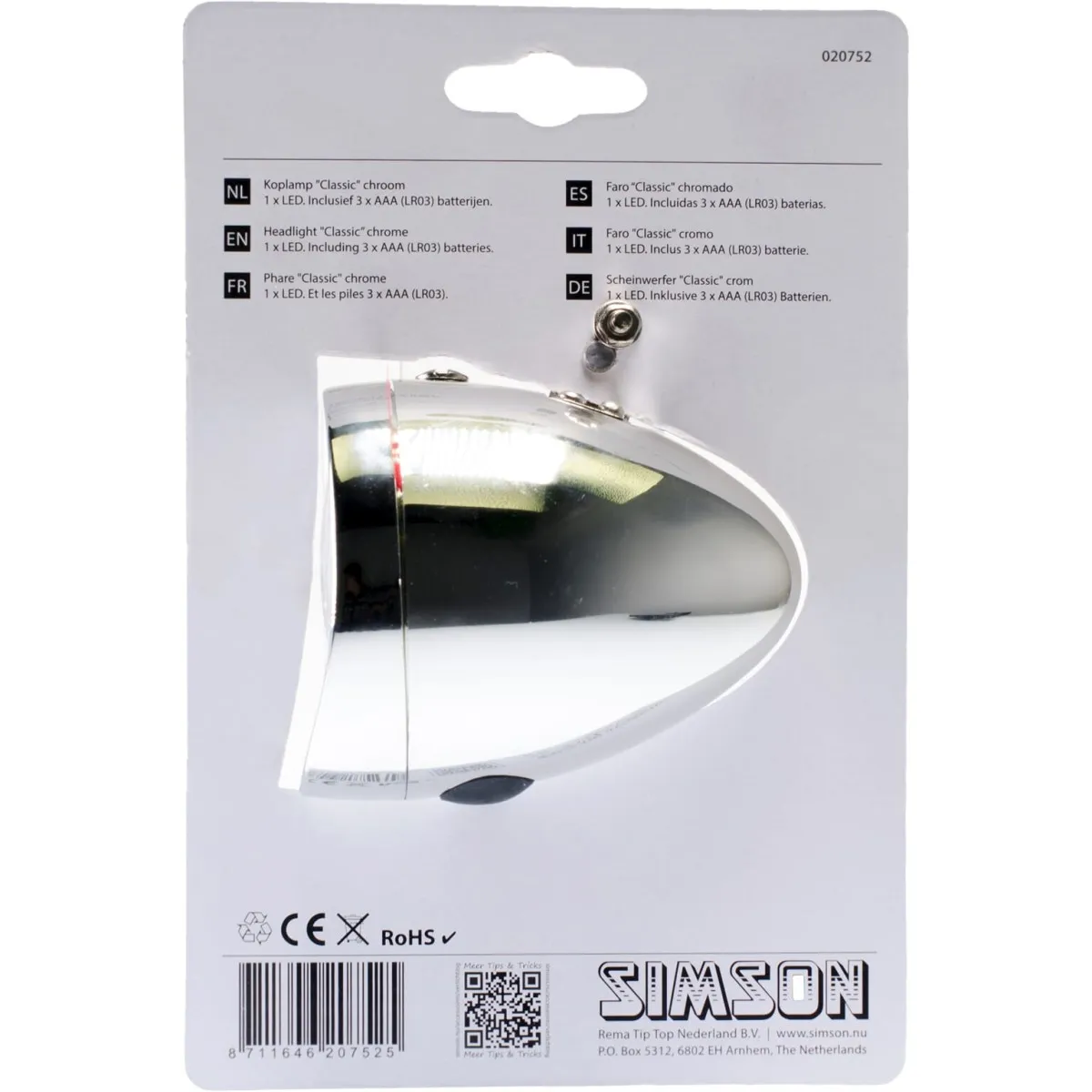De Simson Batterij koplamp Classic chroom is een klassiek model koplamp in LED-uitvoering. De koplamp heeft een zilver met chromen behuizing en een aan- en uitschakelaar op de bovenzijde. Onder andere te monteren op de Simson Snephaak met behulp van een kruiskopschroevendraaier. Inclusief batterijen: 3 x AAA..