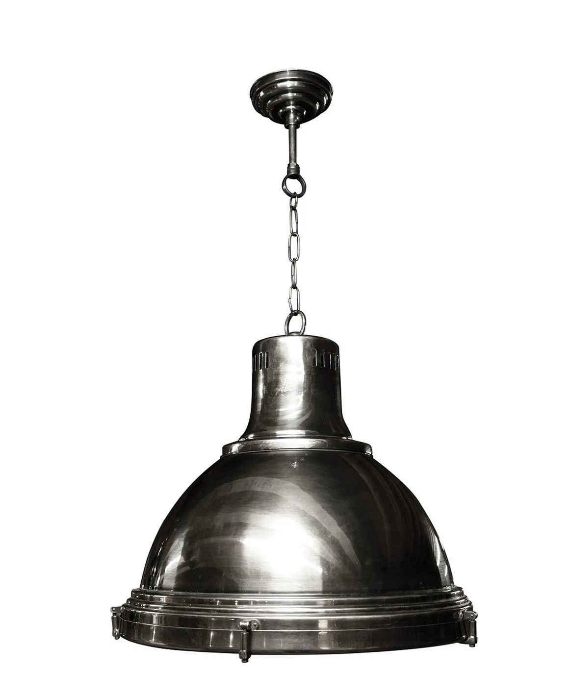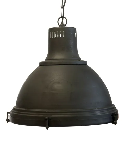 Stoere Fabriekslamp Zwart met industriële details en ketting. Grote robuuste fabriekslamp in antiek zwart. Een industriële lamp van formaat en een design waar je u tegen zegt. Een fraaie keus voor wie zoekt naar een stoer accent in het landelijke interieur. De lamp heeft een diameter van 51cm en de hoogte is 46cm. De glasplaat is stijlvol met veersluitingen bevestigd. Echt een stoer detail. De binnenkant is gebroken wit. Kwaliteit en nog eens kwaliteit. Mooi in grotere ruimtes in herenhuis of woonboerderij, maar ook prima voor zakelijke doeleinden. Hang er bijvoorbeeld 2 boven je grote kloostertafel. Eventueel ook leverbaar in antiek zilver.