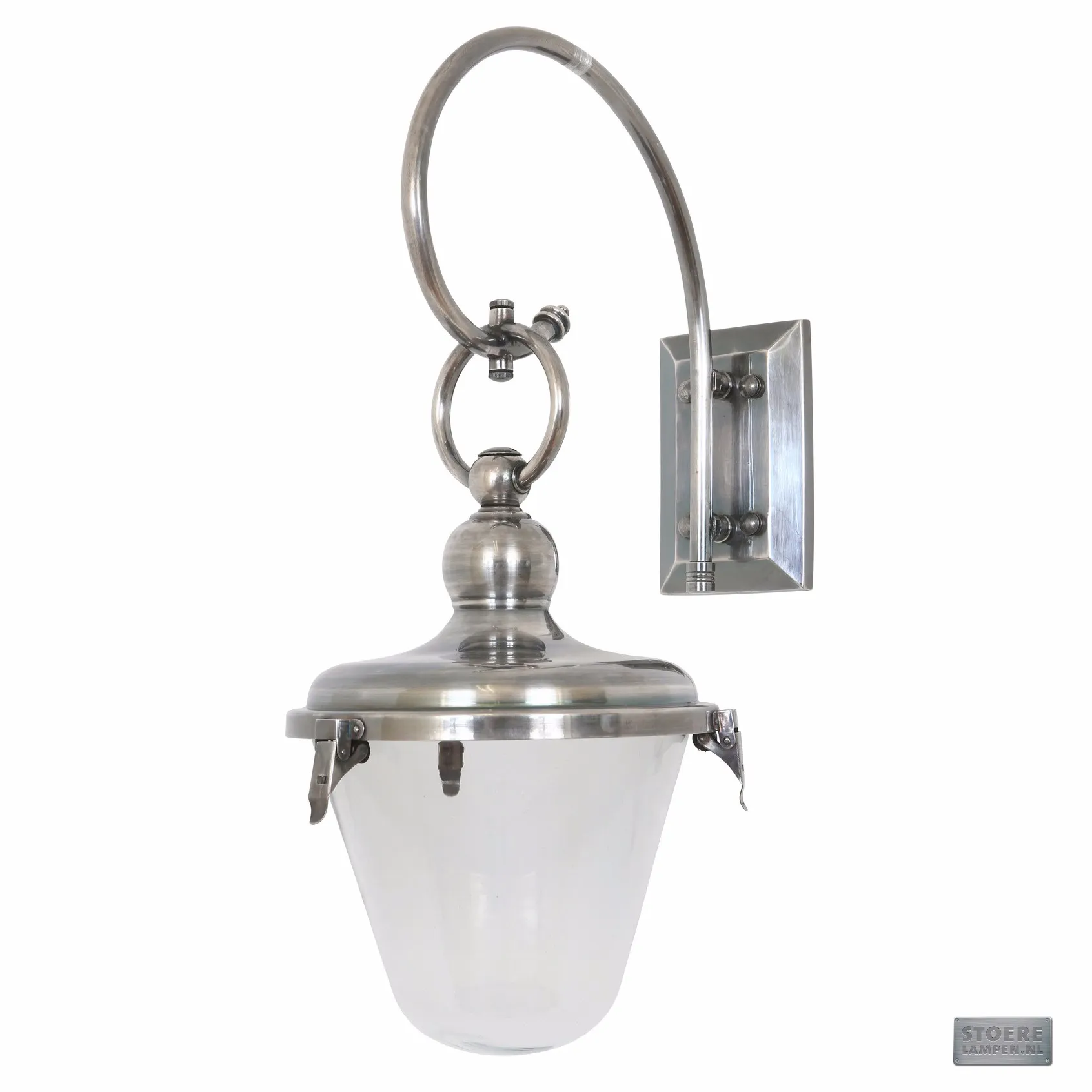 Gewoon de perfecte combinatie van elegantie en stoerheid. Dat is onze landelijke stoere klassieke buitenlamp (IP54) met glas in kelkvorm. Het antiekzilver plated frame is prachtig gebogen, waardoor deze lamp eigenlijk tijdloos is. Na verloop van tijd zal het zilver aan de lucht gaan werken, waardoor de lamp zijn vaak geliefde oude look krijgt. Met slanke clips die bovenaan de lamp zijn bevestigd, lijkt het alsof je naar een bloem kijkt. Deze buitenlamp past heel goed bij landelijke huizen en monumentale panden.